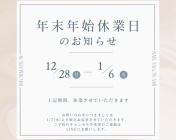2025年11月27日 年末年始のお休みのお知らせと12月予約状況 カテゴリ:予約状況と営業日程のお知らせ あっという間に12月!体とお肌の大掃除のご予約はお済ですか?温める 緩める 巡らせて ほぐして 今年も人知れず頑張ってきた自分を一緒に労いましょう♪【12月のお休み】定休日 月・火その他 6日(土)年末年始休暇 12月29日(月)~1月6日(火)休暇中のお問い合わせには >>続きを読む