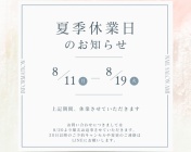 2025年07月22日 8月の休業日について カテゴリ:予約状況と営業日程のお知らせ 〇定休日 月・火〇夏季休暇 11日(月)〜19日(火)〇その他のお休み 30日(土)営業日数が少なくて、ご迷惑をおかけしますがよろしくお願い致します。お休み期間中のご連絡は、こちらのLINEにメッセージをお願いします。少し遅れ気味になるかもしれませんが、順次お返事致します。 >>続きを読む