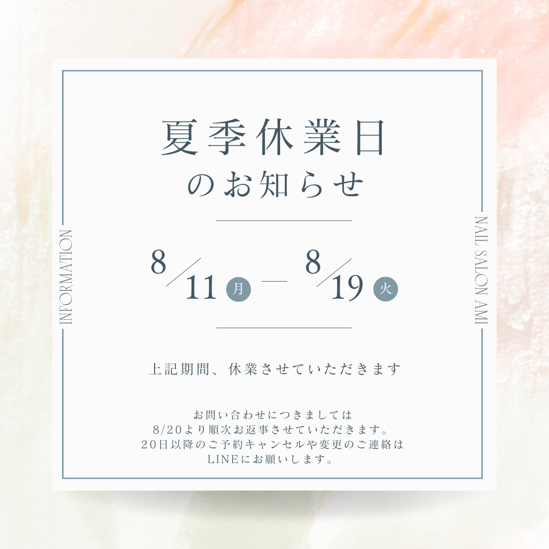2025年07月22日 8月の休業日について カテゴリ:予約状況と営業日程のお知らせ 〇定休日 月・火〇夏季休暇 11日(月)〜19日(火)〇その他のお休み 30日(土)営業日数が少なくて、ご迷惑をおかけしますがよろしくお願い致します。お休み期間中のご連絡は、こちらのLINEにメッセージをお願いします。少し遅れ気味になるかもしれませんが、順次お返事致します。お急ぎの内容でないものは、お休み明けのお返事とさせてください🙏